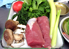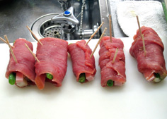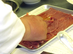 下味をつけたフィレ肉を広げ、小麦粉を薄くつける。ここにインゲン、ハム、セロリ、生しいたけを手前において捲いて行く |