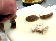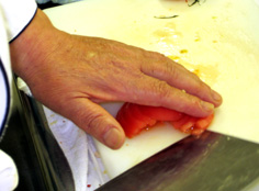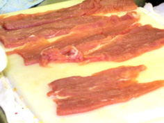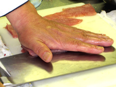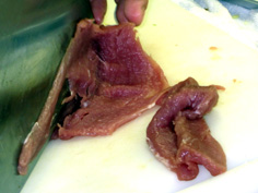次に庖丁を入れて、今度は切り落とす。写真のように幅の広い一枚の肉になる |