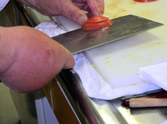 飾りのトマトは半分に切り、切り落とさずに3ヶ所庖丁を入れる |
