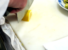 レモンは縦半分に切り、厚めに切る。更に厚みに2ヶ所途中まで切り目を入れ、そこにパセリを挟み込む |