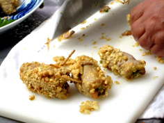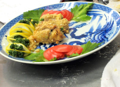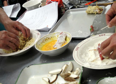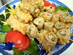材料 4人分 豚フィレ肉 400g 生しいたけ 4枚 インゲン(ボイル) 100g セロリ 1/3本 ハム 2枚 卵 2個 小麦粉 80g カシューナッツ 200g ※飾り用にレタス、トマト、パセリ、レモン ※肉の下味用 酒 大さじ2 塩 小さじ1/2 醤油 大さじ1 コショウ 少々 ※食べる時用 山椒塩、岩塩、オーロラソース(マヨネーズとケチャップ)を好みで |