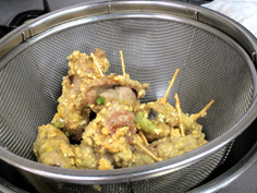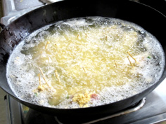 油で揚げるが、この時の温度は100度位で指を入れられるほど。ゆっくり温度を上げて最後に強めにする |