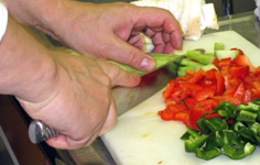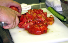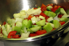 青ピーマン・赤パプリカ・キュウリを1cm角に切る |