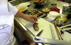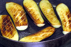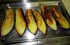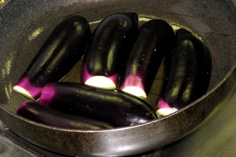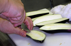 飾りのナスを切る。縦半分に切り、火が通りやすいように斜めに5〜6箇所、きり目を軽く入れる |