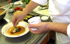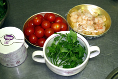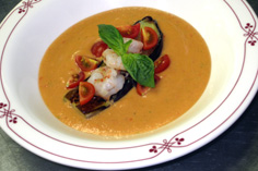 冷ましたガスパチョを敷き、ナスをのせる。小エビとプチトマト、バジルを飾る |