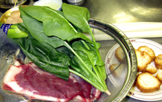材料 6人分 蔵王鴨ロース(230〜260g) 1枚 仙台油麩(戻す) 6枚 長ネギ 1本 ほうれん草 1把 溶き辛子 少々 ※調味料 一番だし 360cc 濃口醤油 45cc 味醂 45cc 砂糖 大さじ1/2 |
