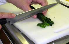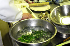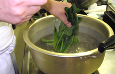 ほうれん草を、塩少々加えたお湯でゆでる。最初は根元から |