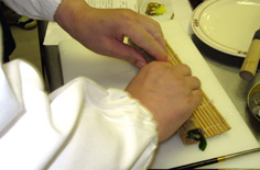 水気を切って巻きすでまき、形を整える。この時、葉と根元を交互に揃えて巻く |