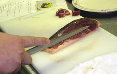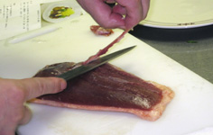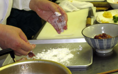 下味をつけた鴨肉に片栗粉をつける。全体にしっかりつけること。これがトロミになるので |