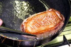 フライパンに少量の油を引き、皮目から焦げ目がつく様に焼く |