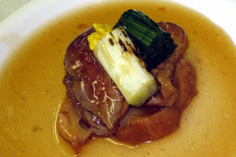 器に鴨肉と油麩を盛り、ネギとほうれん草を飾り、汁を少しかける。溶き辛子を添えて、完成! |