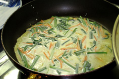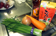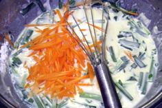 ニラ、人参、薄切りの玉ねぎを加える |