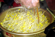 鍋に少なめの水ともやしを入れ、フタをして火にかける。弱火でゆっくり |