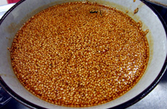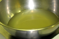 鍋に、ネギの青いところとショウガの薄切り、粒山椒を加えて沸かす。 |