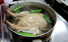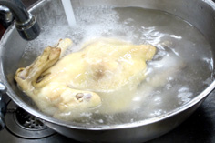 沸いたら火を弱め、鶏を入れて40分ほどボイルする |