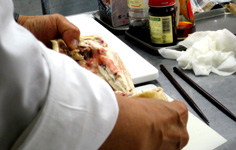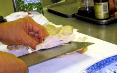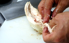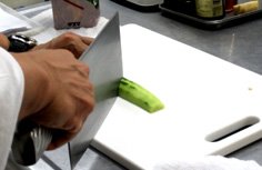 キュウリは皮をむき、縦半分に切る。端を残して斜めに細かく切れ目を入れ、5〜6等分に切り落とす |