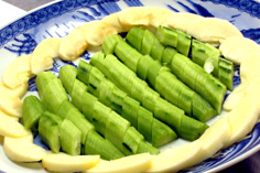 キュウリ 2本 リンゴ(皮をむき櫛形にし、塩水に浸ける) 1/2個 松の実(煎る) 少々 小ネギ 少々 |