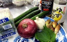 材料 4人分 紫玉ねぎ 中1個 ミョウガ 4個 貝割れ大根 1P キュウリ 2本 青シソ 4枚 ニンニク 4片 エキストラバージンオリーブオイル 100cc ゆずポン酢 120cc |