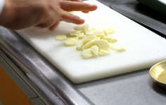 最初に、ニン二クチップを作る。ニンニクは2〜3mmの薄切り(薄すぎるとすぐ焦げ付く) |