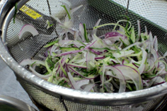 付け合せの野菜を一緒に、水を入れたボールに入れて混ぜ、ザルに上げて水気を良く切る |