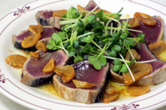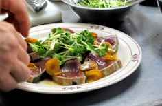 皿に野菜を盛り、鰹を並べ |