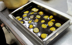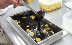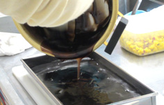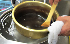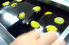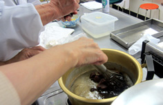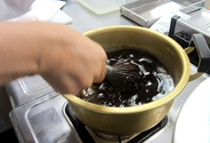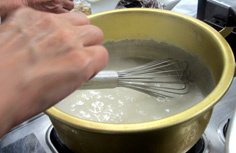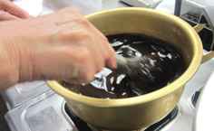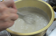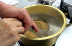 手にはねるので注意。次第にツヤが出てくる。最後に水アメを加える |