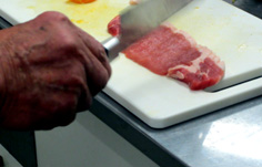 ロース肉の脂身と肉の間の筋を2ヶ所ほど切り、全体を庖丁の背で軽くたたく |