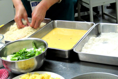 溶き玉子と牛乳を混ぜる。バットに小麦粉、溶き玉子、パン粉と並べて用意 |
