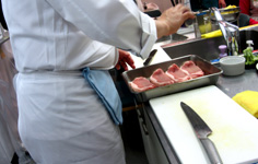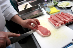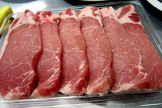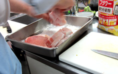 ロース肉は脂のところに2ヶ所ほど切れ目を入れて、筋を切る |