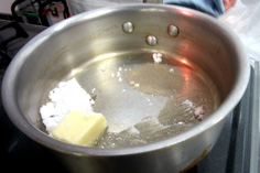 鍋に少量の水とバター、砂糖、塩少々を入れ、溶かす |