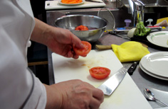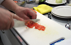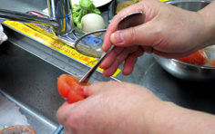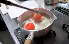 トマトはヘタを取り、熱湯に入れて湯剥き |