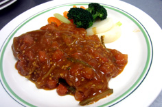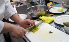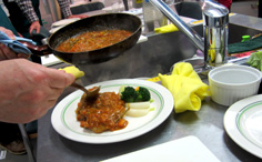 皿に付け合せの野菜と肉を盛り、ソースをかける |