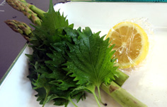 材料 1人分 鯵(1尾200g) 半身 大葉 2枚 アスパラガス 1/2本 レモン |