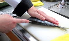 庖丁を向きを変えて差し込み、左手で押さえながら中骨に沿わせて、一気に切り分ける |