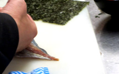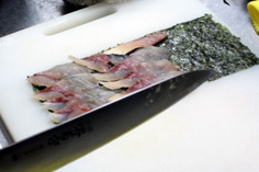 鯵をそぎ切りにし、焼き海苔の上に並べて行く |