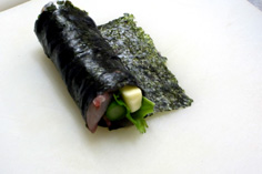 真ん中に大葉とアスパラガス、チーズを乗せて巻き、水でとめる |