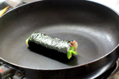 油を引かないで、フライパンに巻き目を下にして並べ、転がしながら鯵に火が通るぐらいまで火を入れる |