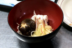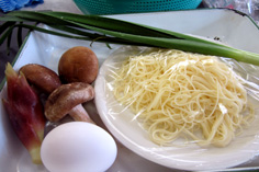 玉子素麺と生シイタケ、花ミョウガを乗せ、味付けした出汁を張って、完成! |