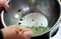 沸騰したお湯に酢少々を入れ、ニラ卵白を流し入れる |