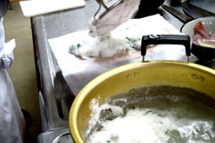 バットに巻きすとさらしを乗せて準備。火が入ったら、引き上げます。 |