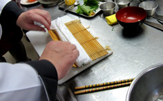 最後にしっかり四角になるように巻きすで締め、冷蔵庫で落ち着くまで冷やす |