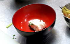お椀にニラ豆腐を入れ |