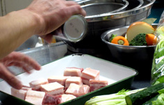 豚バラ肉を50gの角切りにカット。全体に塩、コショーを振る |
