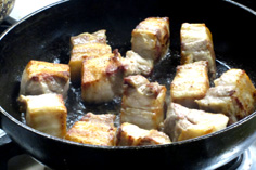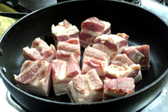 フライパンに入れ、焼色を付ける。油を引かずに脂身を下にする。最初は強火にしてから中火で焼く |