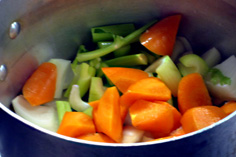 深鍋にオリーブオイル、大さじ1を入れ、野菜を炒める。この時、塩少々を加える。油が全体に馴染むくらいまで炒める |
