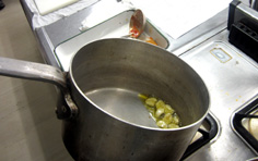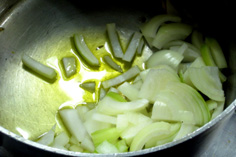 タマネギを加えて炒める。塩少々を加える |