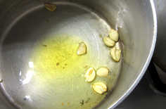 鍋に種を取った唐辛子と、芯を取ってつぶしたニンニク、オリーブオイル大さじ2を入れてから火をつける |