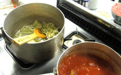 鍋に塩とオリーブオイルを入れて、ペンネを茹でる。ソースの鍋にペンネを加えて、味が馴染むように1分ほど煮込む |
