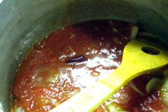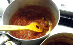 トマトを加え、中火で煮つめる。唐辛子を戻す |