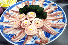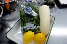 材料 6人分 豚バラ肉 600g ホウレン草 2袋 ダイコン(おろす) 1/2本 レモン 2個 昆布・日本酒 各適宜 |